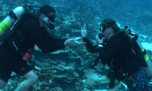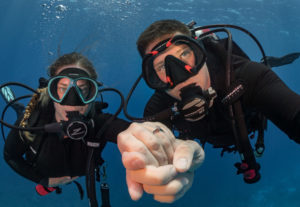I kept the ring in its box in my BCD pocket, in my BC2, and I just waited for the perfect moment. I actually had that ring in my BCD for about a week before I found the perfect dive site. Just before we got in the water, I asked our dive guide if at a certain point during the dive if you could take a picture of us? I told him, ‘When you do that, I’m gonna pop the question!’ He was really excited!
