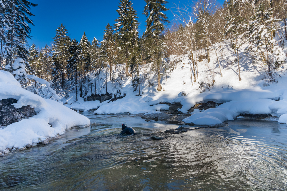 Many years I have been waiting for the right conditions to create the true winter atmosphere in Austrian Alps. That day came in January 2017 after three weeks of deep freezing temperatures and lots of snow fall. When driving around Attersee I noticed a violet fog hanging over the surface and blue shades all over the place. A sign of really cold weather. My car showed –22°C .