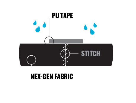 Using hot air, a polyurethane tape is applied to a sewn seam, combining the seam and tape into a weld. The combination actually becomes stronger than the surrounding material—creating an unbreakable seam. SWT can be found on the Nex-Gen.