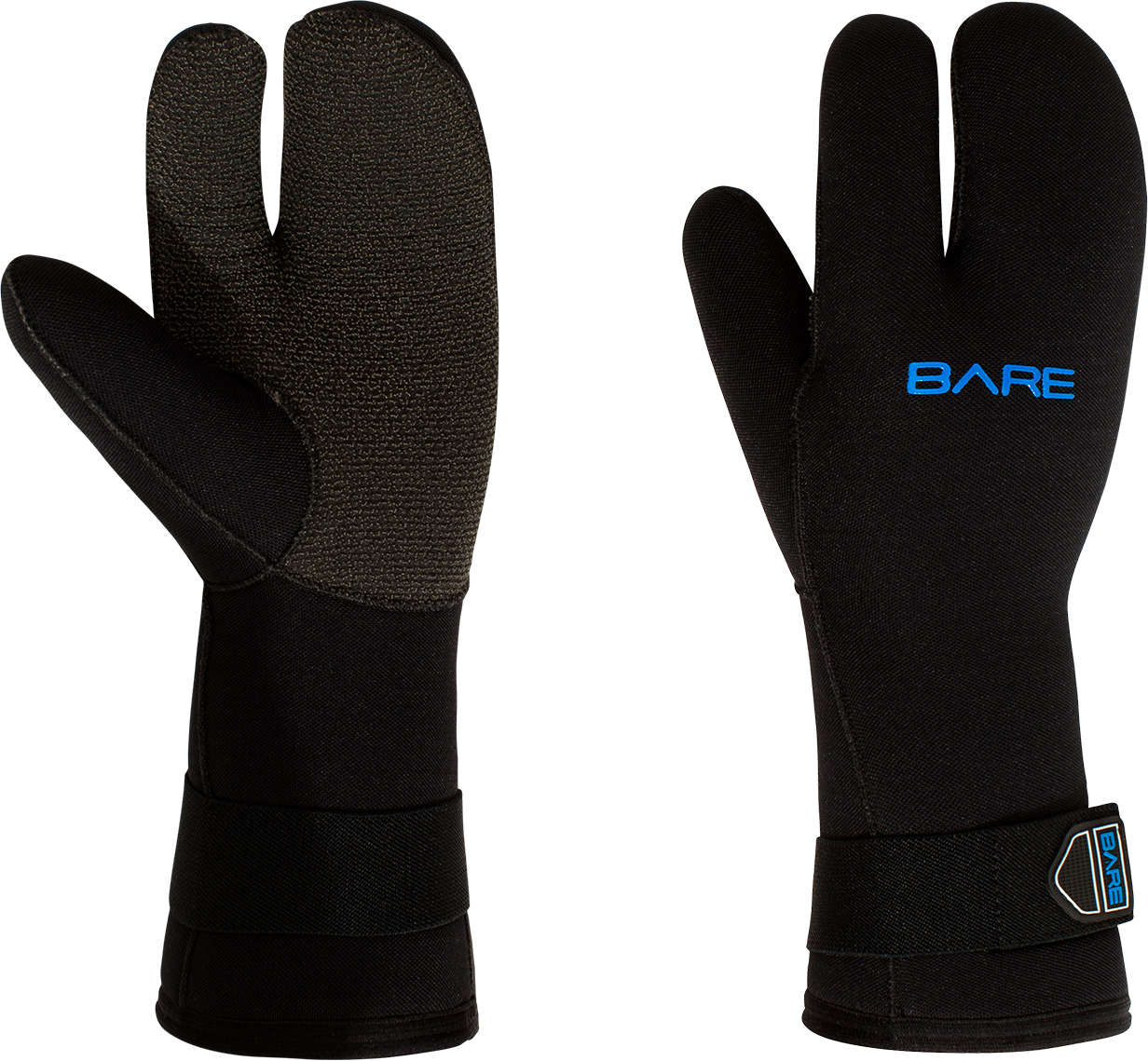 The BARE 7mm K-Palm 3-Finger Mitt is for those diving in cold waters that prefer the three-finger mitt style glove and are looking for additional warmth and abrasion protection. DIAMOND-TUFF nylon laminate provides high abrasion resistance and Kevlar covers all surfaces and wards against possible punctures or wear in high prone areas.